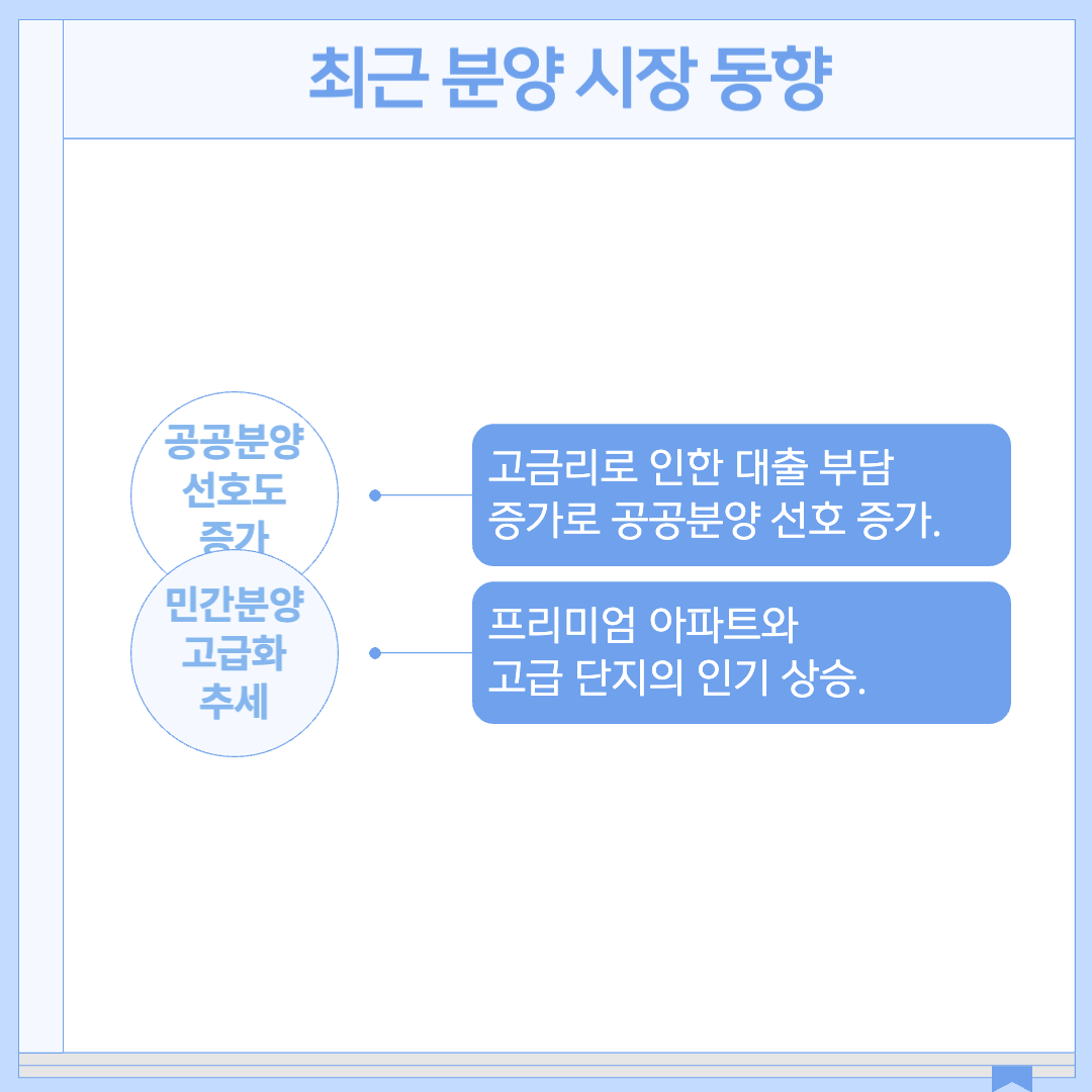 - 민간분양의 고급화 트렌드: 민간분양 시장에서는 프리미엄 브랜드와 특화된 커뮤니티 시설을 갖춘 고급 아파트 단지가 꾸준히 인기를 끌고 있습니다. 이에 따라 민간분양에서의 경쟁률은 더욱 높아지고, 수요가 집중되는 고급 단지의 경우 추가 분담금 발생 가능성이 있습니다.
