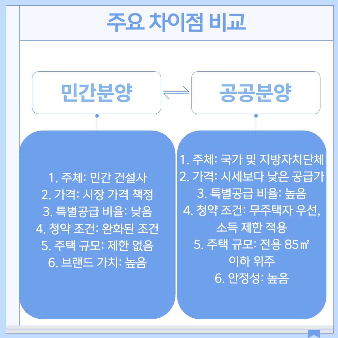 민간분양과 공공분양은 각각의 장단점이 있으며, 투자 및 실거주 목적에 따라 선택이 달라질 수 있습니다.