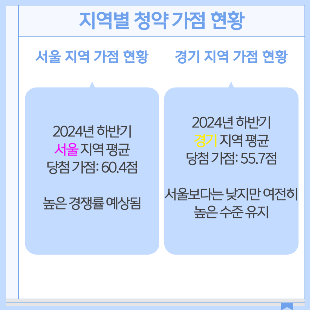 지역별로 청약 경쟁률과 당첨 가점은 상이합니다. 특히 서울과 같은 대도시에서는 높은 가점이 요구됩니다.