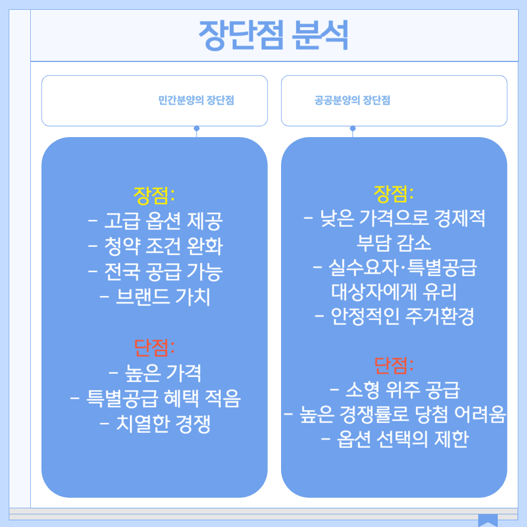 - 단점: 가격이 시장에 따라 높을 수 있으며, 공공분양 대비 특별공급 혜택이 적어 경쟁이 치열함.