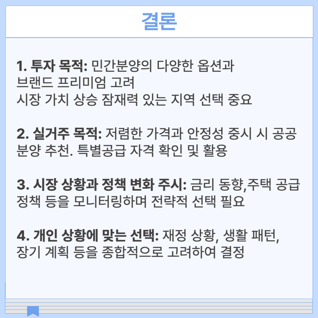 민간분양과 공공분양은 각각 고유의 장단점이 있으며, 본인의 재정 상태와 주거 수요, 실거주 여부에 따라 선택이 달라질 수 있습니다. 만약 투자 목적으로 접근한다면 민간분양의 다양한 옵션과 브랜드 프리미엄을 고려할 수 있으며, 실거주를 위해 저렴한 가격과 안정성을 원한다면 공공분양을 고려해보는 것이 좋습니다. 현재의 시장 상황과 향후 정책 변화를 꾸준히 주목하여 자신의 상황에 맞는 전략적 선택을 하시기 바랍니다.