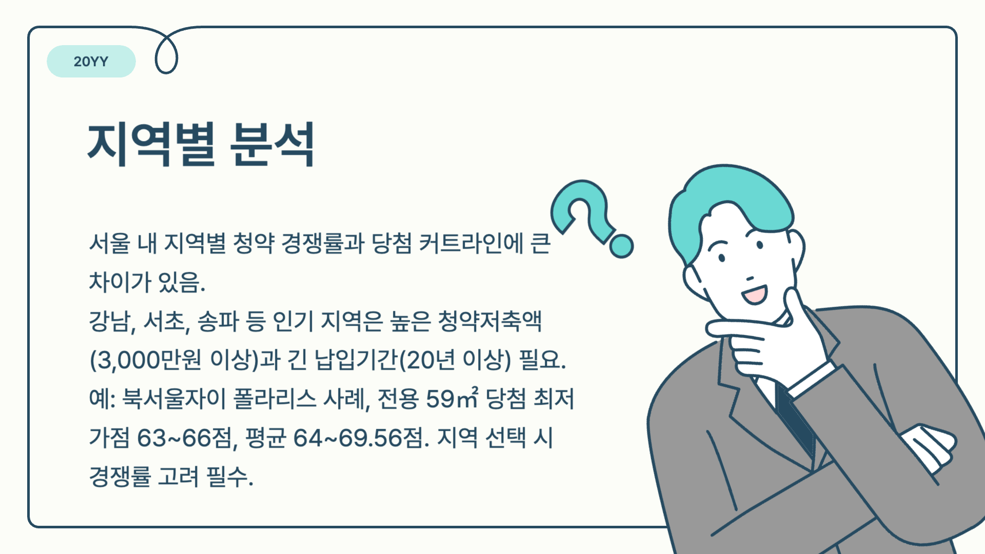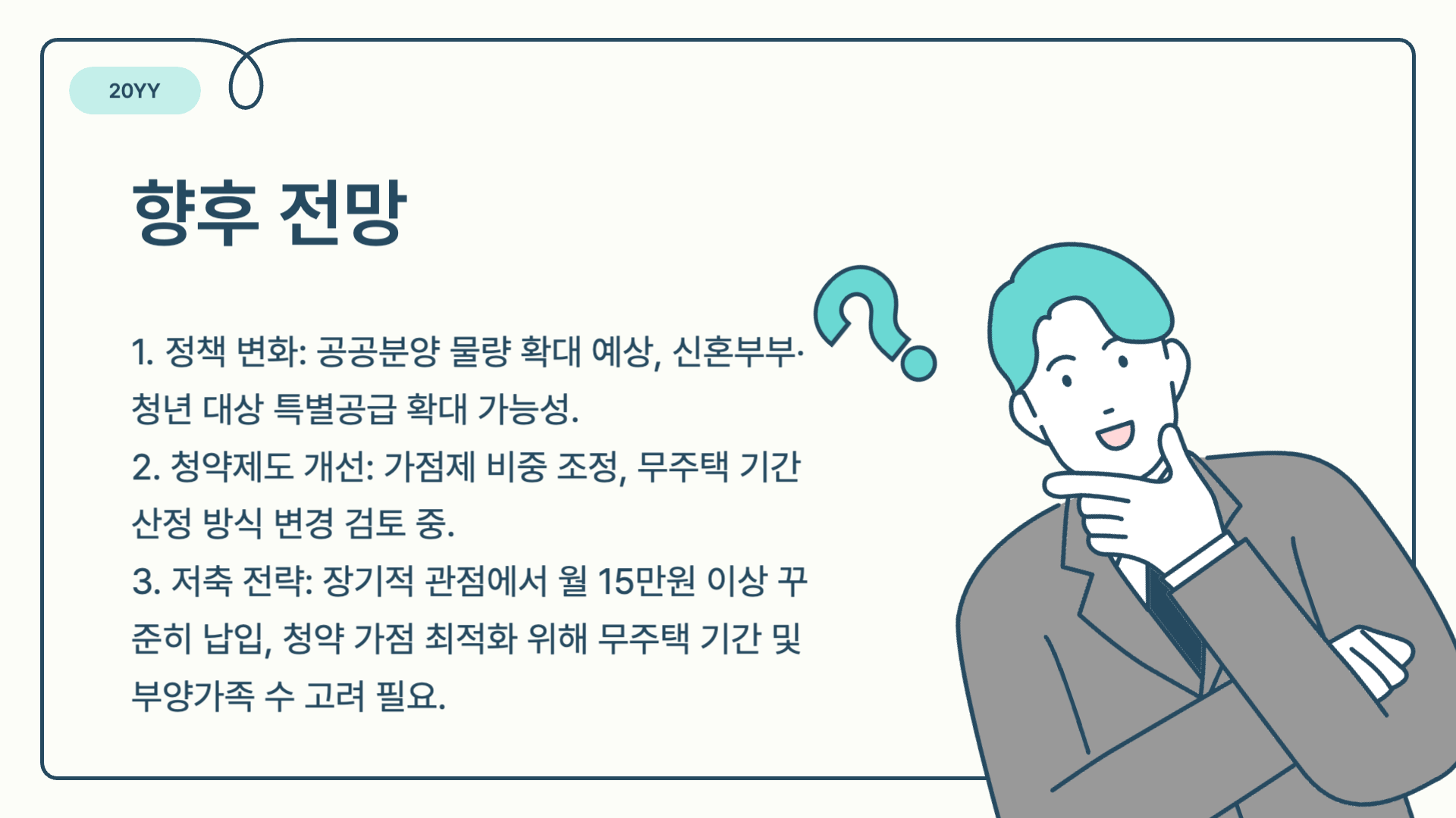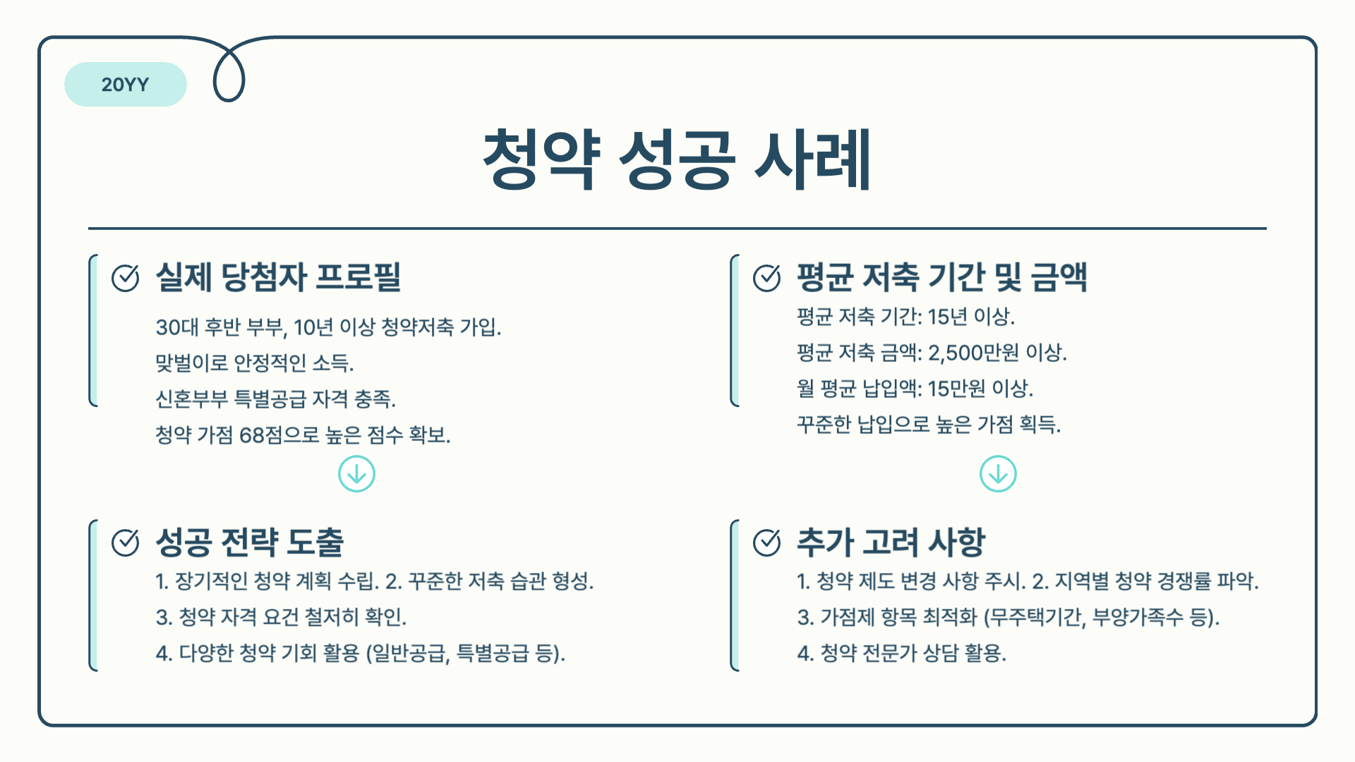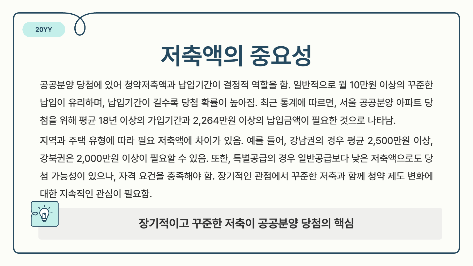 - 저축 전략: 장기적 관점에서 월 15만원 이상 꾸준히 납입, 청약 가점 최적화 위해 무주택 기간 및 부양가족 수 고려 필요.